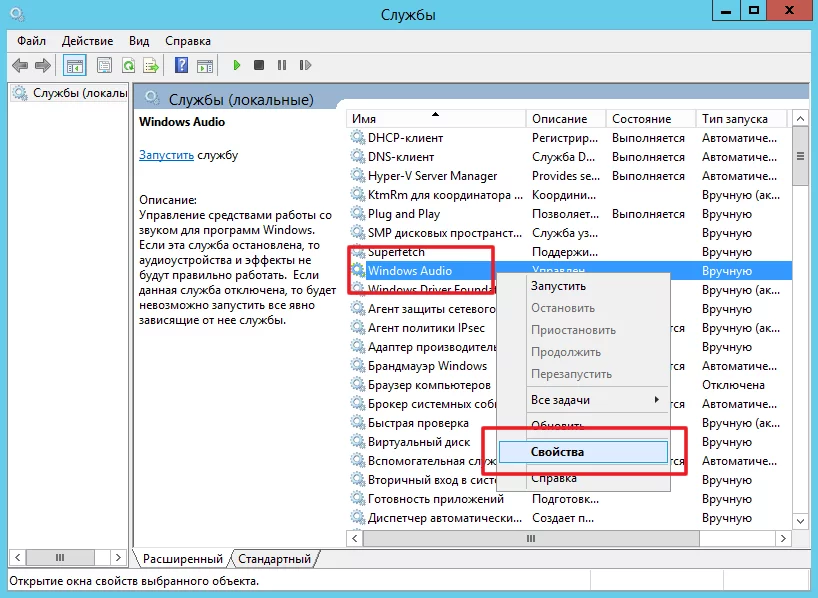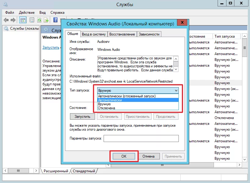 Запуск службы Windows Audio