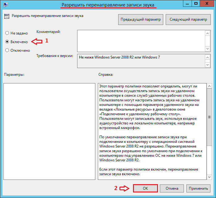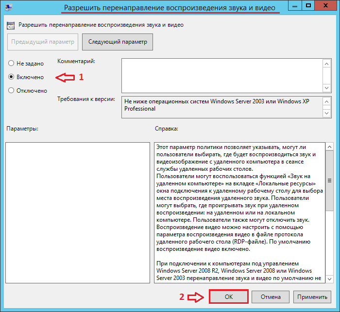 Конфигурация компьютера -> Административные шаблоны -> Компоненты Windows -> Службы удалённых рабочих столов -> Узел сеансов удалённых рабочих столов -> Перенаправление устройств и ресурсов -> Разрешить перенаправление воспроизведения звука и видео
