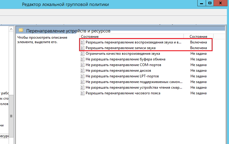 В разделе «Перенаправление устройств и ресурсов» в верхней части списка находятся две нужные политики: