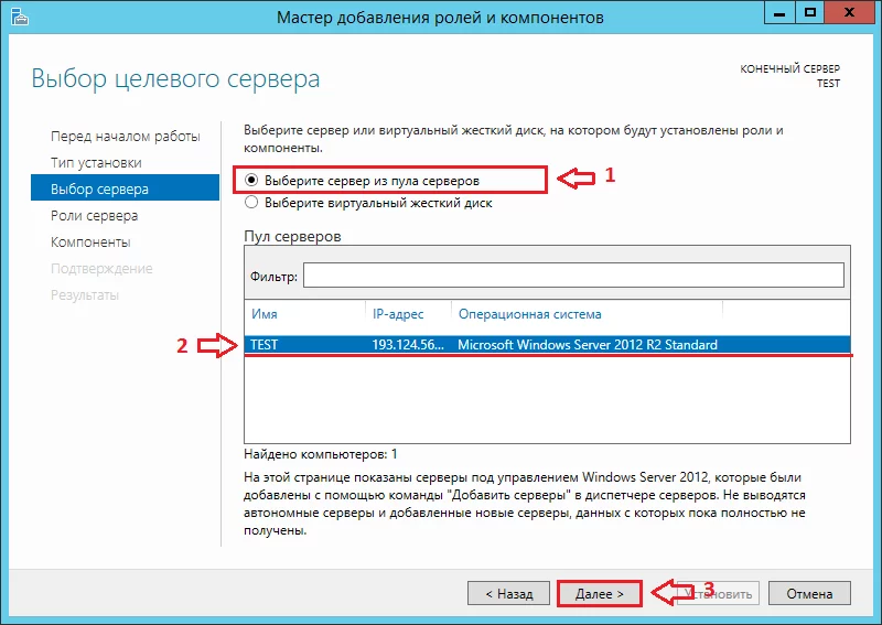 На следующем шаге укажите «Выберите сервер из пула серверов», затем выделите ваш сервер в списке и нажмите «Далее».