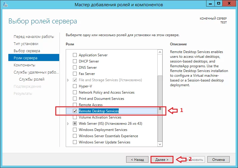 Далее в списке «Роли сервера» выберите «Remote Desktop Services» и нажмите «Далее».