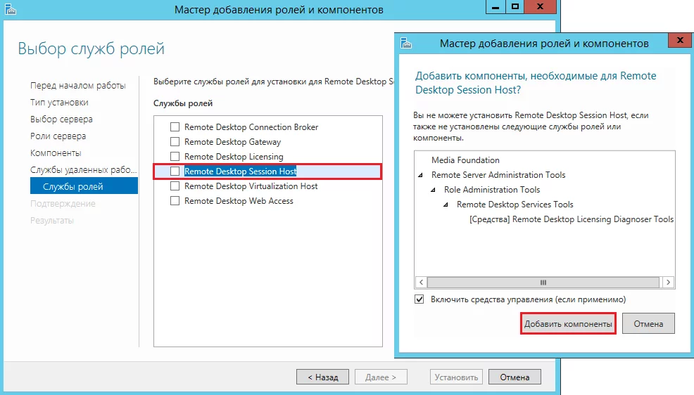 Наиболее важный этап - выбор «Служб ролей». Здесь отметьте «Remote Desktop Session Host». После этого появится дополнительное окно, в котором нужно нажать кнопку «Добавить компоненты».